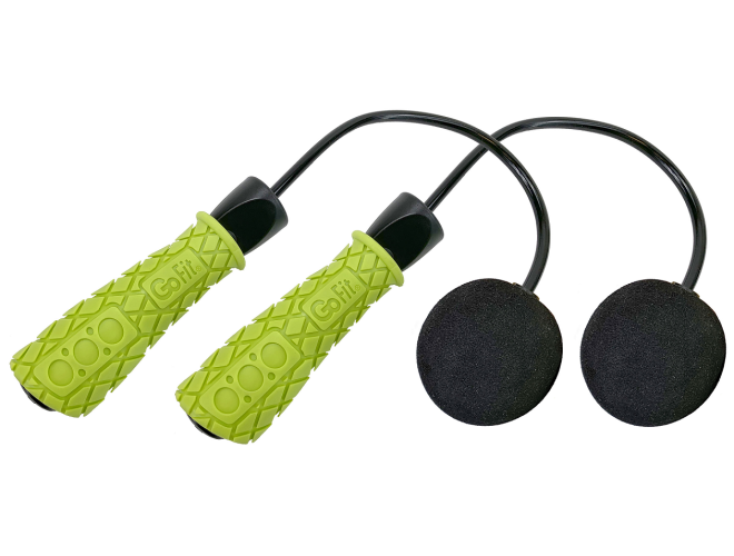 Get your toning-and-cardio jump rope workout, indoors or anywhere with GoFit’s Ropeless Jump Rope. Its short, PVC ropes spin with ball bearing precision, while the lightly-weighted foam balls create centrifugal force for arm-toning resistance. No length adjustments or tangles, just a great jump rope workout anywhere. Train. Recover. repeat. GoFit!